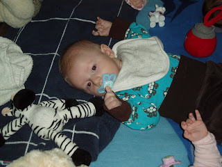 Idag kom alla bebisar med sina mammor hem till oss. Vi brukar ju träffas en gång i veckan. Mamma hade köpt färska frallor som hon bjöd på. Medans våra mammor fikade låg vi på min Ior filt och busade. Jag tyckte det var konstigt till en början med andra bebisar på min filt. Jag stirrade på dem och höll koll så att de inte rörde mina gosedjur. Mamma sa att man måste dela med sig. Det kanske hon har rätt i. När Nikita höjde rösten blev jag jätte rädd. Som tur var fanns mamma vid min sida, och hon tröstade mig i sin varma goa famn. Efter fikat gick vi alla ut en sväng i det vackra vädret. Vi mötte en gammal dam som var pratglad. Hon tyckte det såg mysigt ut med så många mammor på promenad. Hon tittade in i vagnarna och tyckte vi bebisar var så söta. Efter promenaden gick vi hem till oss igen. Mammorna fikade ännu mer. De var tvugna att värma sig med lite kaffe.